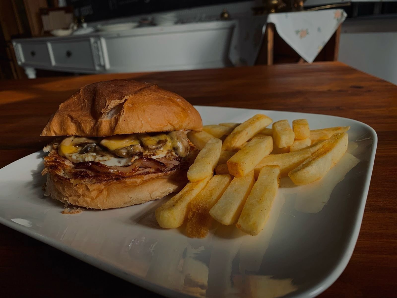 Start your day right with our delicious Breakfast Bun. A soft toasted bun is loaded with a fried egg, crispy bacon, savoury mushrooms, and melted cheese. Served with a side of golden fries.