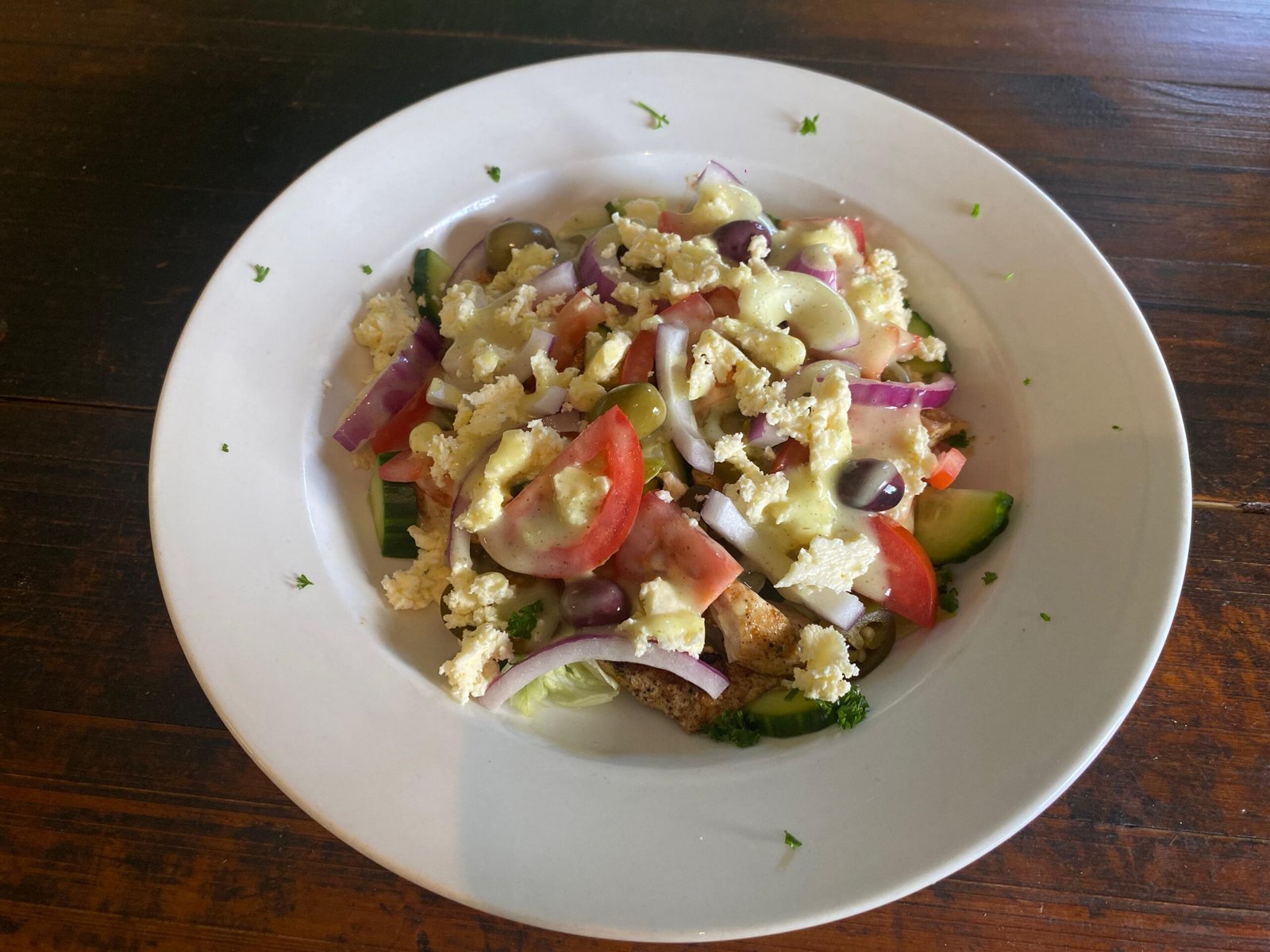 A vibrant and flavourful salad featuring tender grilled chicken strips, crisp mixed greens, juicy tomatoes, cucumber, and red onion. Topped with crumbled feta cheese and a zesty jalapeño dressing for a delicious kick.