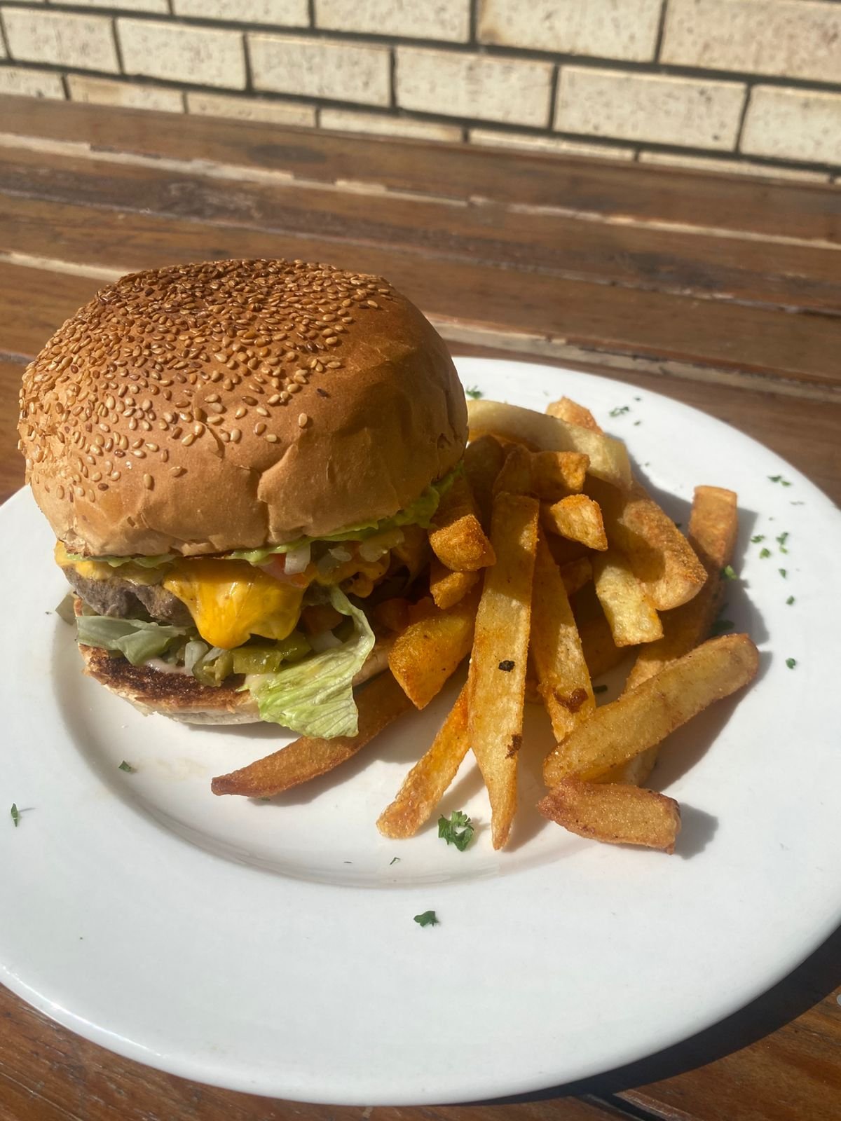 Get ready for a fiesta in your mouth! Our Mighty Mexican Burger features a juicy beef patty topped with a fiery blend of jalapeños, melted cheese, fresh guacamole, and salsa. Served with a side of crispy golden fries.