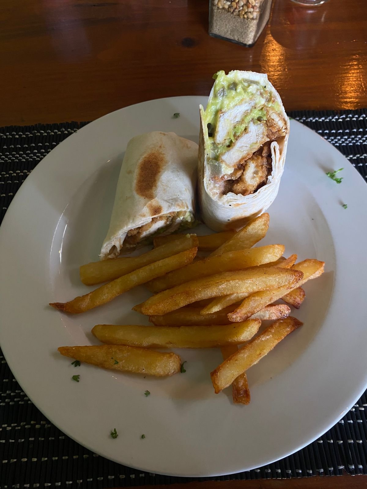 Our Rasta Special is a flavour-packed wrap featuring tender, spiced chicken strips, creamy guacamole, and a zesty mix of fresh ingredients, all rolled in a soft tortilla. Served with a side of golden fries.