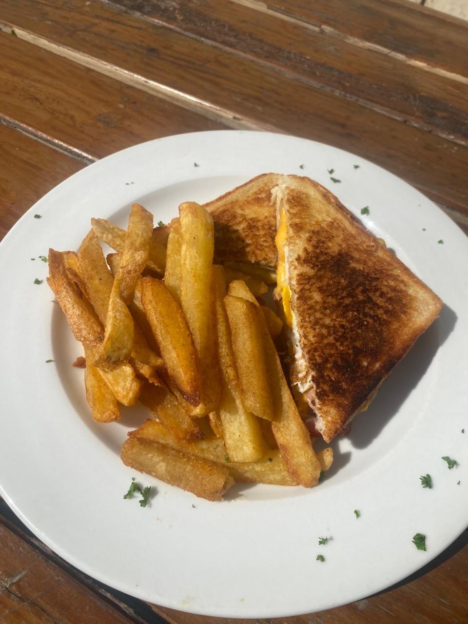 A classic comfort food favourite. Our Bacon, Egg, and Cheese Toastie features crispy bacon, a perfectly cooked egg, and melted cheese, all grilled to golden perfection between two slices of bread. Served with a side of our delicious fries.